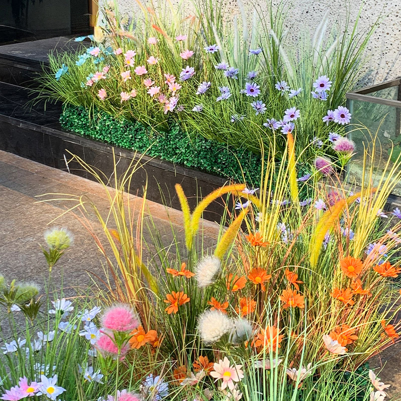 デパートの店舗に緑の植栽を配置して花の溝を飾って花の飾り物をシミュレーションします。