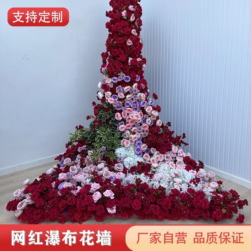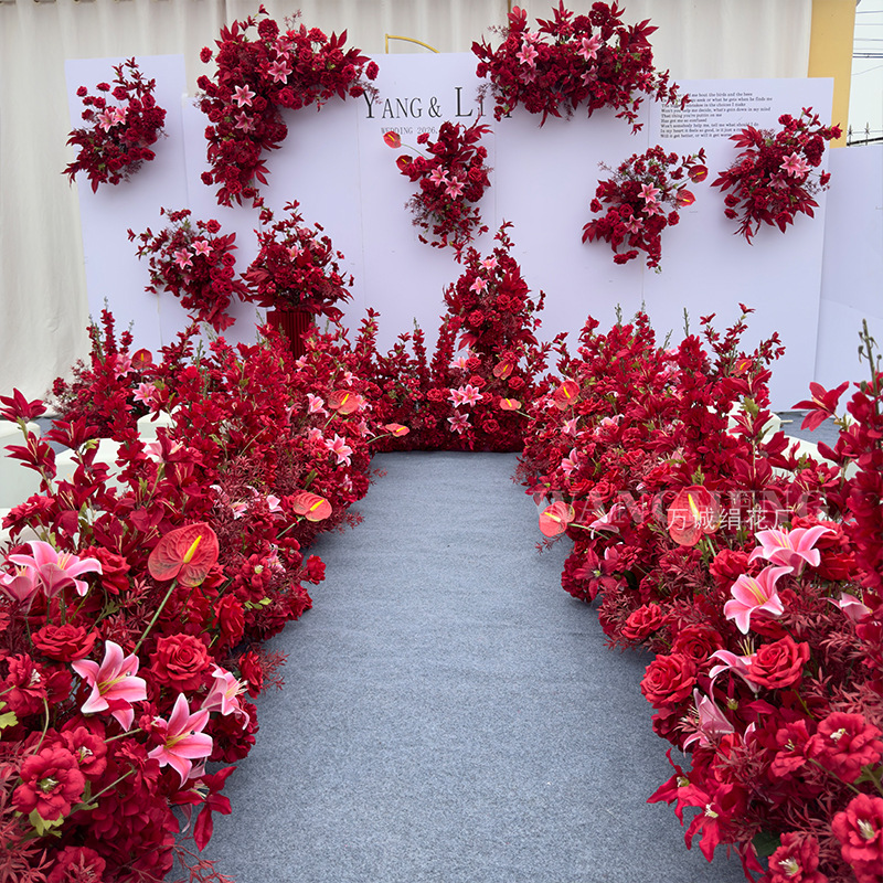 バラの滝のシミュレーション花の商店街の美陳ネットの赤いカードは花の壁の結婚祝いの花の結婚式の装飾の造花を配置します。