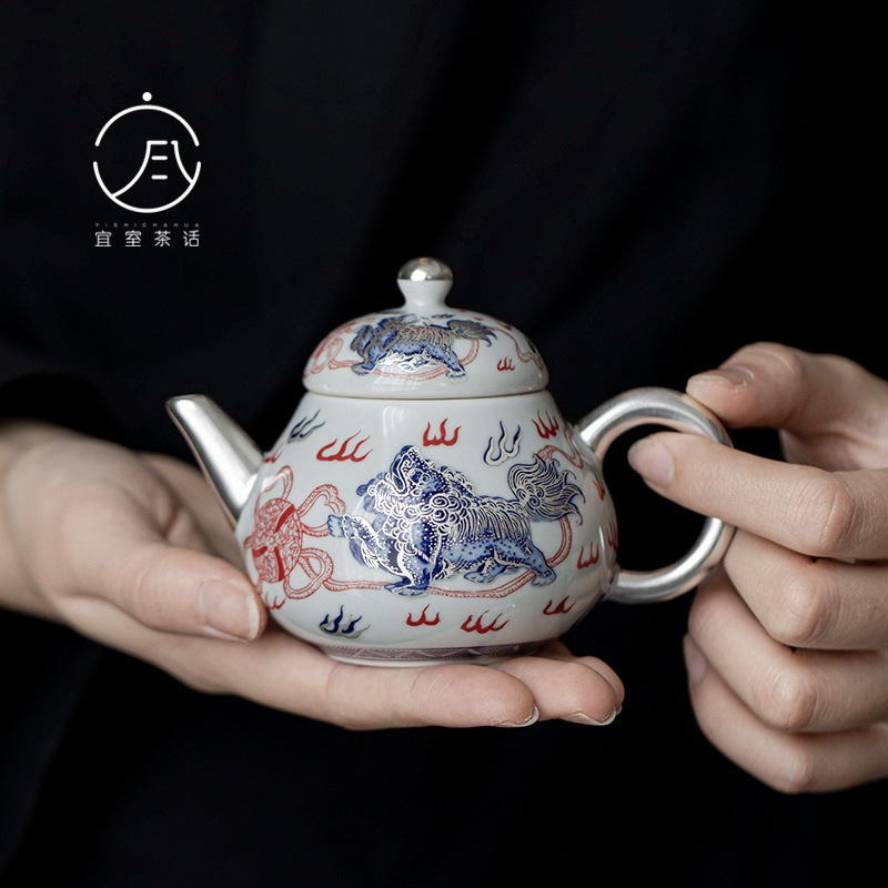 宜室のお茶の話999純銀の純度の銀はライオンの陶磁器のティーポットの中国式の復古の泡のティーポットを目覚めさせます。