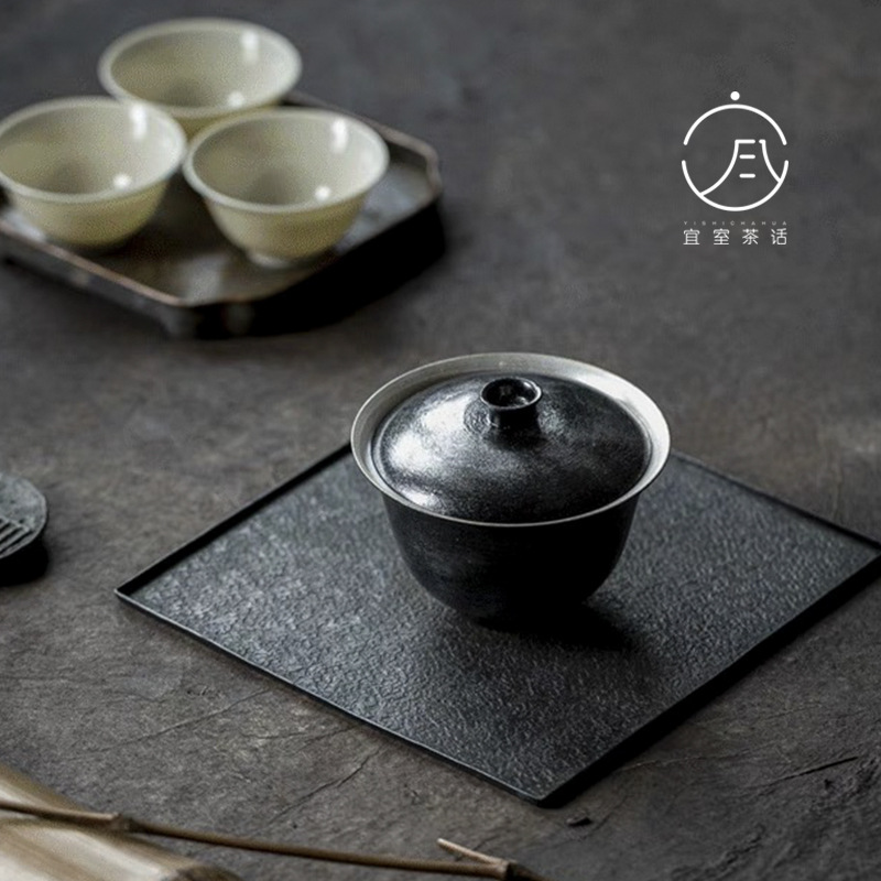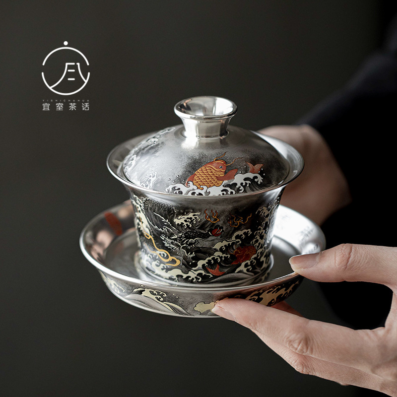 宜室茶話999純銀銀墨龍三才蓋碗蓋付茶碗高級工夫茶道具茶碗杯