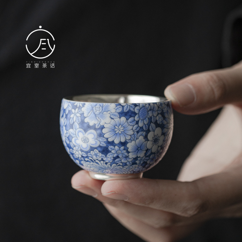 999純度の銀エナメルカラー青と白の陶磁器の主人の杯の工夫の杯の家庭用の復古の1個のお茶の杯はお茶の杯を飲みます。