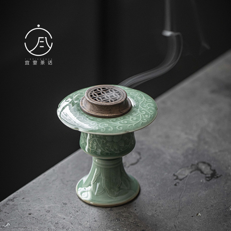 宜室のお茶の話の青磁の浮き彫りの枝蓮の香炉の家庭の室内の皿の香の沈香炉の茶道の部品の陶磁器の行炉