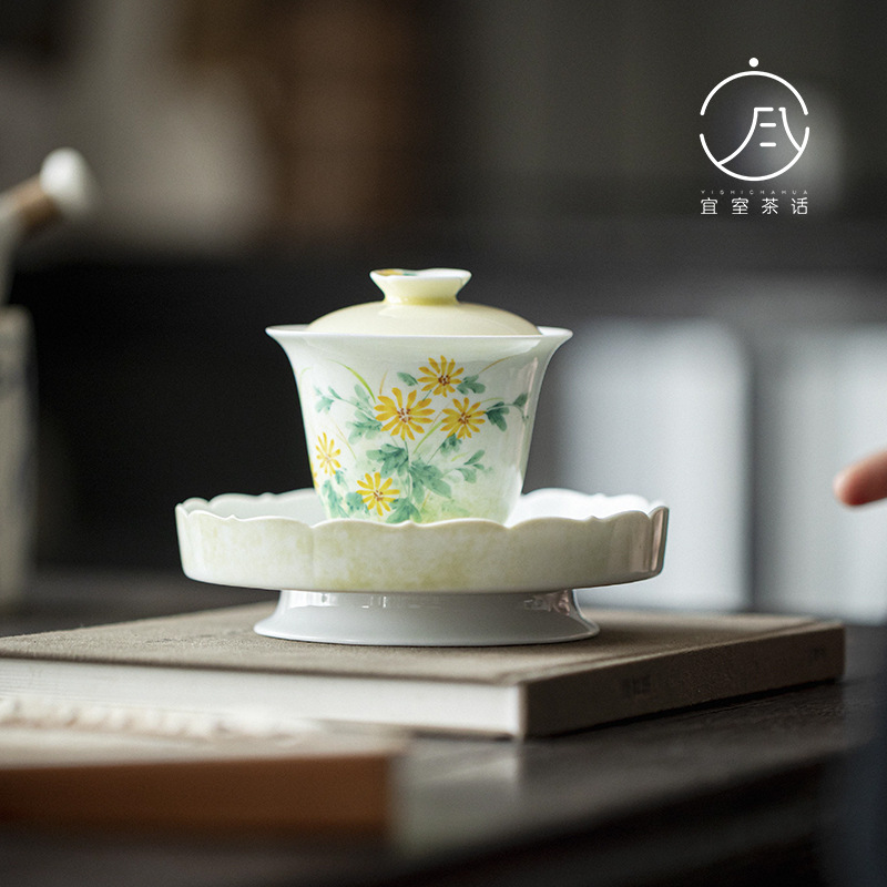 宜室のお茶の話の手描きの野菊は陶磁器の蓋の工夫の茶器の家庭の2才はお茶の碗を浸して手の茶碗を温めません。