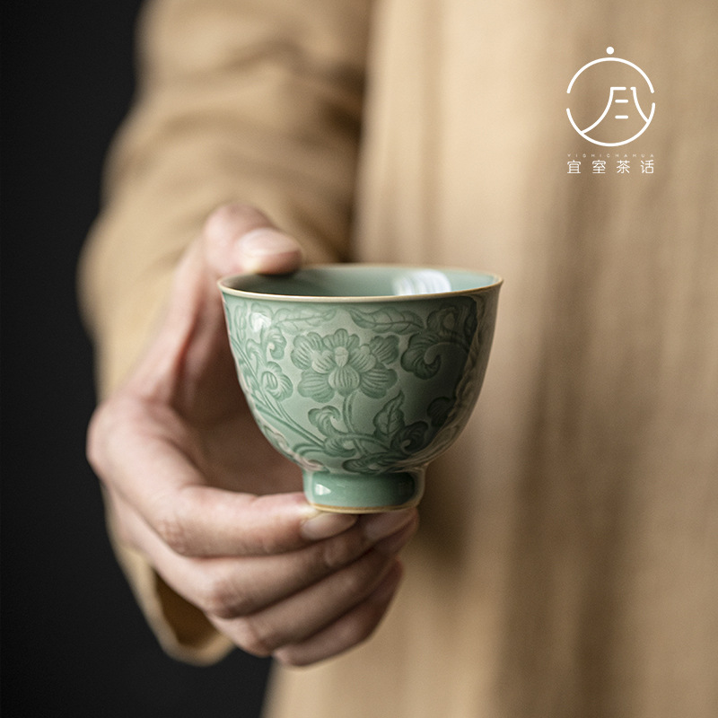 越窯擬古青磁器の手作りレリーフの枝蓮の品茗杯陶磁器の杯の工夫の茶器の主人の杯はお茶の杯を飲みます。