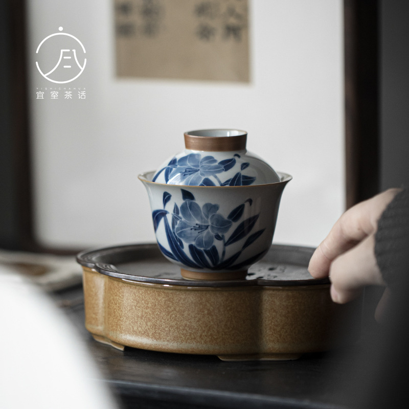 宜室のお茶の話は古風な手描きのユリをまねて碗の文人の茶器の陶磁器をかぶせてお茶の碗を浸します。