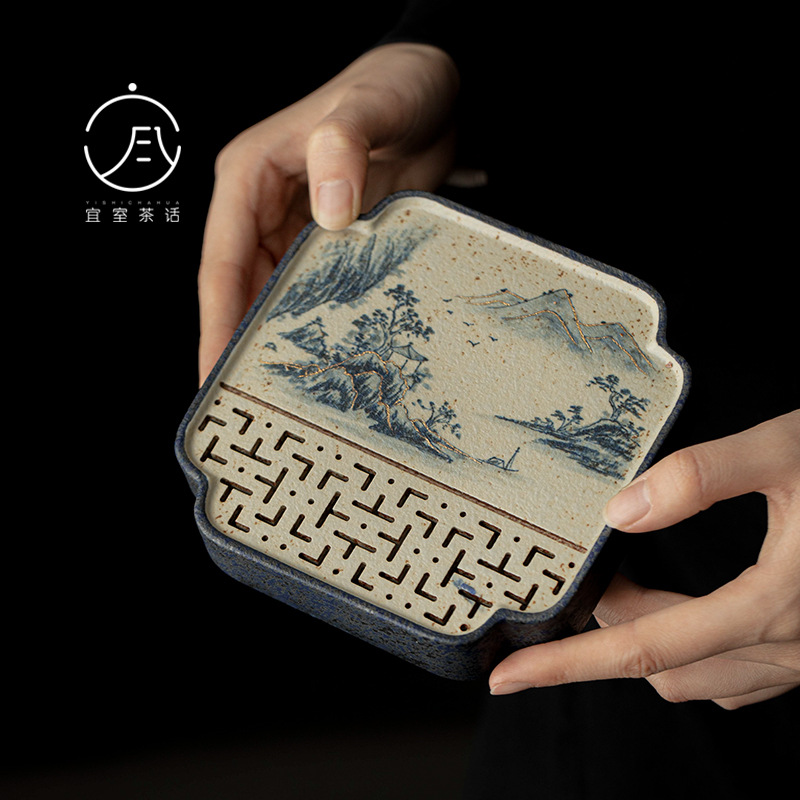 宜室茶話手描き青花山水壺承乾泡台貯水茶トレー工夫茶道具中国式陶磁器茶皿
