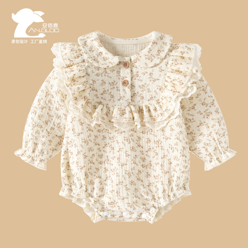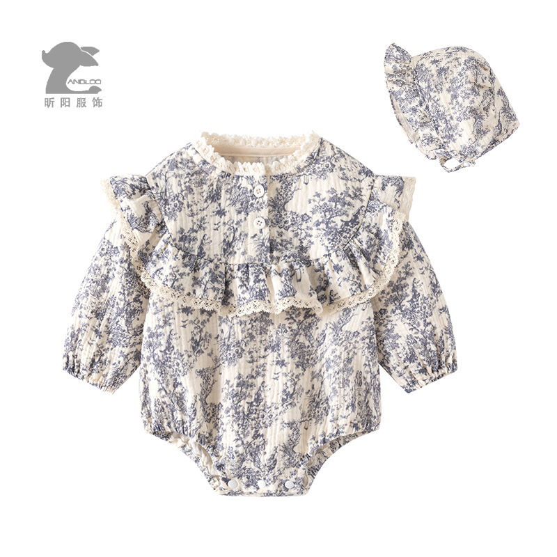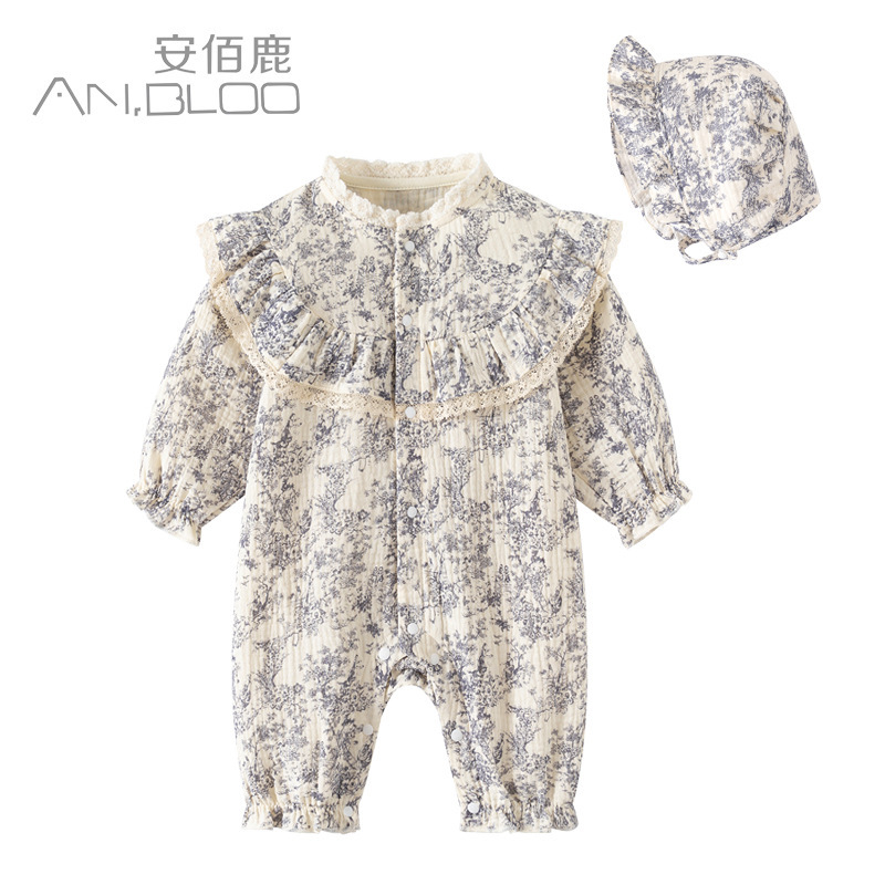洋風ベビー服純綿ガーゼ水墨画長袖ベビー女の子三角パッケージジャンプスーツ帽子付き