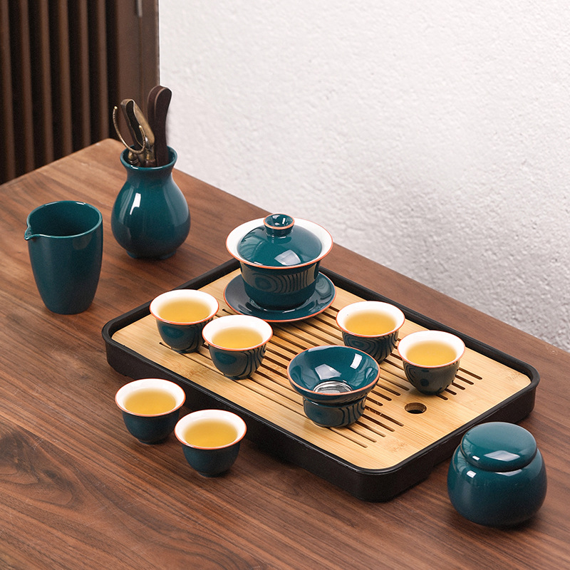 藍のハイエンドの陶磁器の茶器の蓋の碗のティーポットのセットの2022新型の家庭用の軽くて豪華な工夫のお茶の中国式のお茶の泡の茶器
