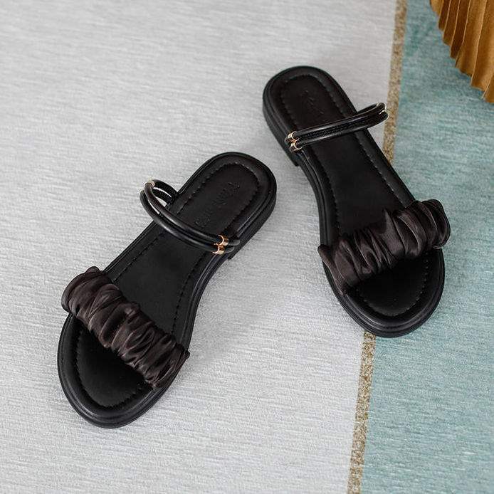 女性用サンダル、2025年夏新作レースプリーツフェアリースタイルフラットサンダル、薄底ツーウェアビーチスリッパ