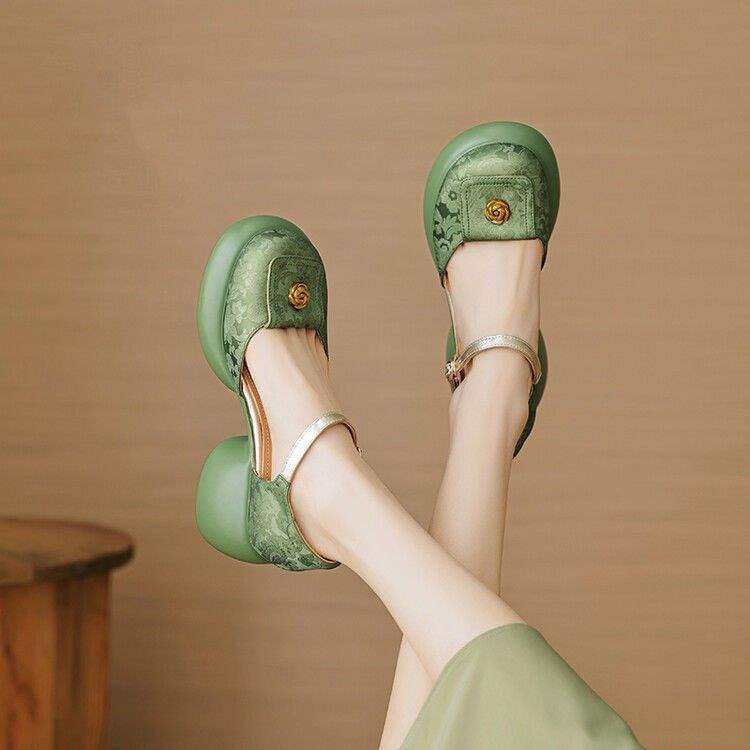 ラウンドトゥシングルシューズ、新しい中国風、エンボス加工ソフトレザー、中空つま先、ワンストラップサンダル、厚底、太いヒール、夏の婦人靴