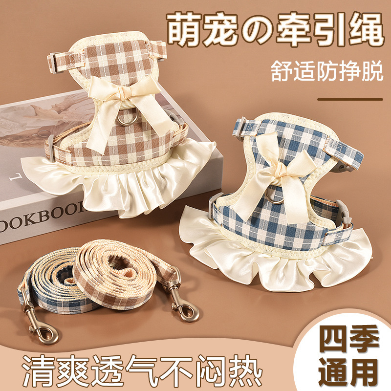 ペットリード 犬猫チェック柄スカート ベスト型リード服 お出かけ服 ハーネス 犬用リード