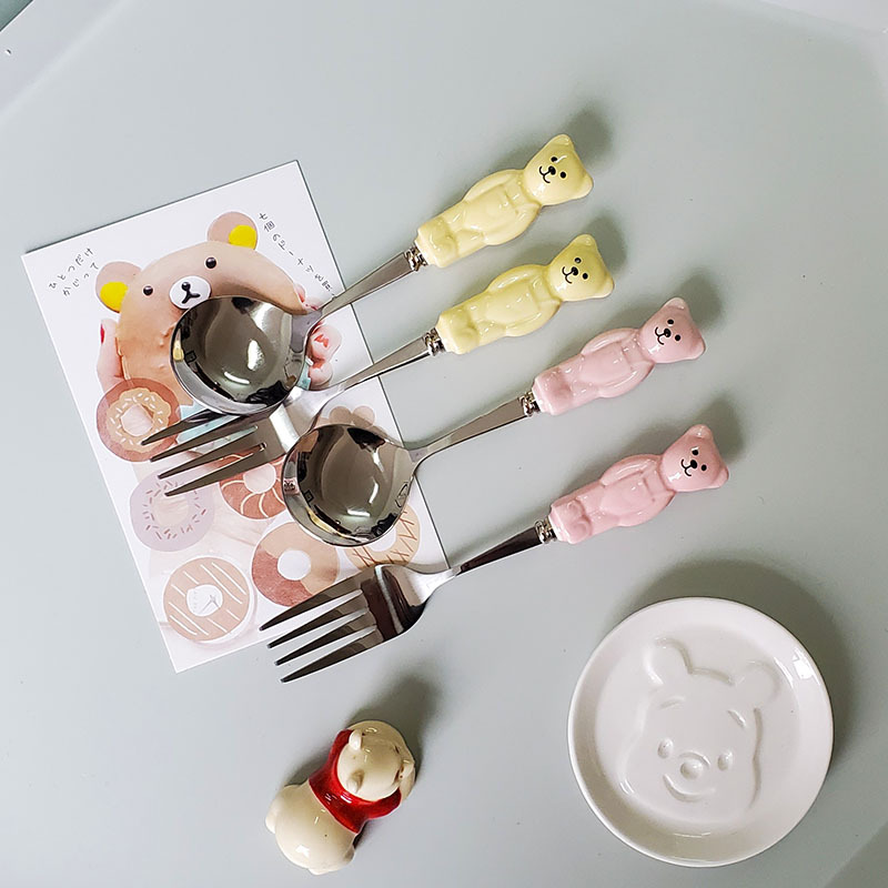 かわいい漫画スプーンフォークセラミック長いハンドルフォークスプーンクリエイティブステンレス家庭用子供スプーンスープスプーン