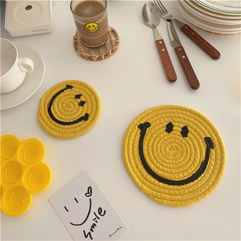 Ins風韓国版厚実熱大鍋マット笑顔表情編みコースターかわいい円形綿糸断熱マット