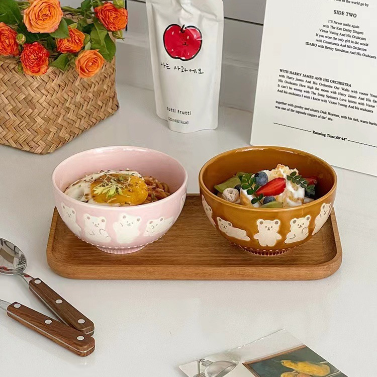 Ins風かわいいベアー陶磁器ボウル家庭用食事ボウル子供ヨーグルトボウル釉薬下彩食器ご飯ボウル