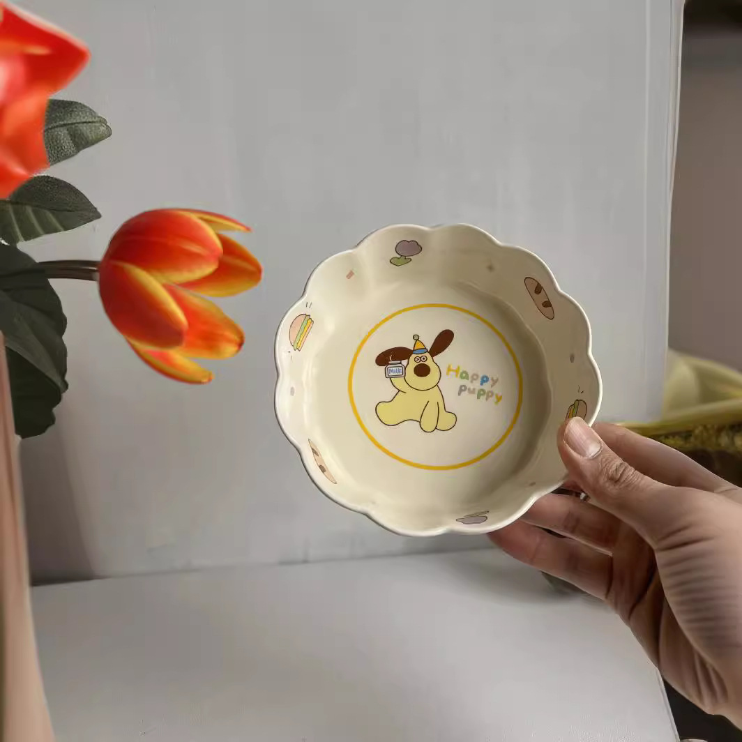かわいい陶磁器の縁の碗の高い顔の価値のサラダの碗insアニメの大きい耳の犬のデザートの碗の家庭用の子供の朝食の碗