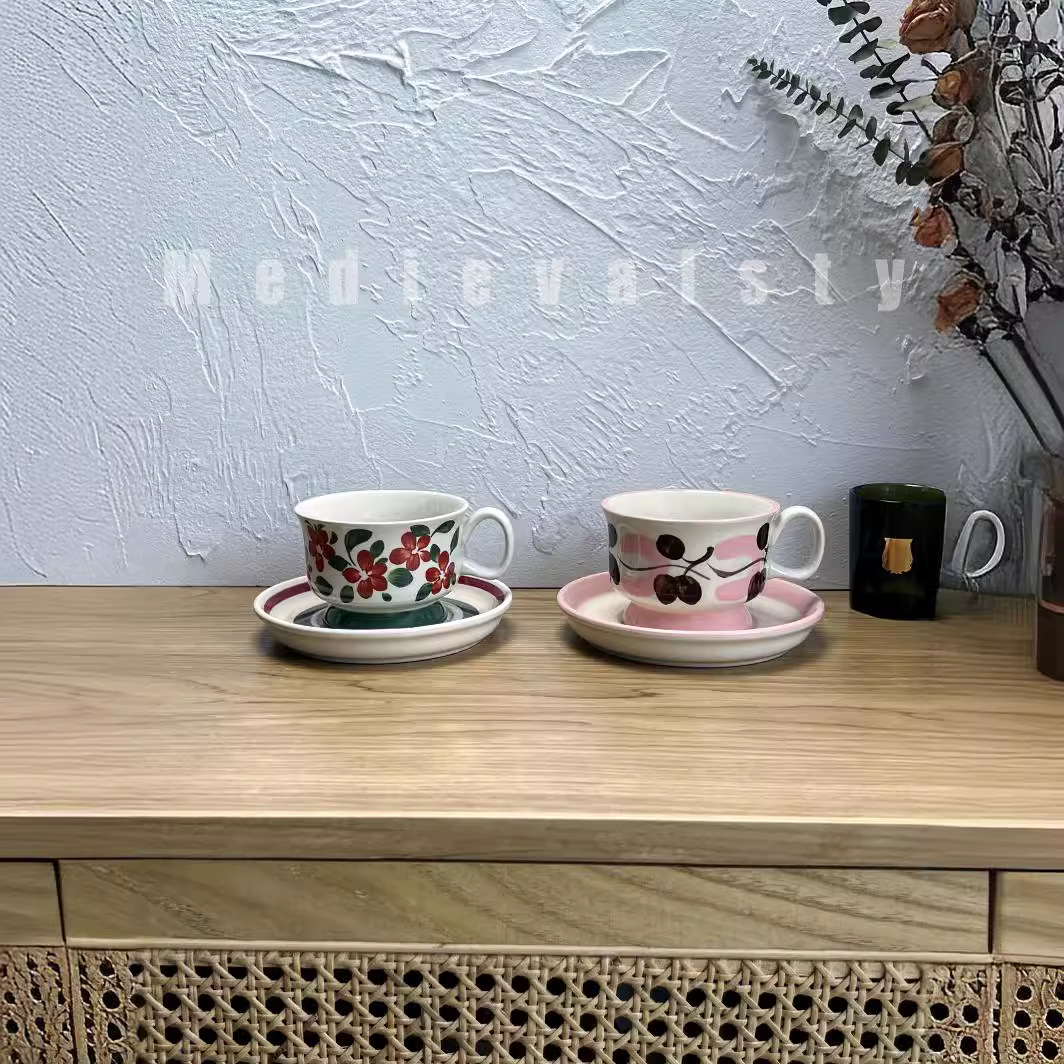 中古風手描き砕花コーヒーカップ皿フィンランド型レトロ紅花緑葉カップ家庭用午後茶陶磁器カップ