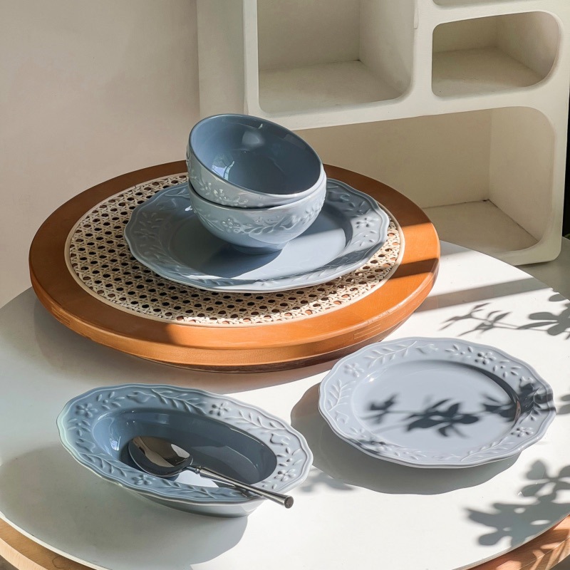 Insレリーフ花鳥家庭用陶磁器食器セットミルクイエロー光楕円深盤平盤高颜値茶碗