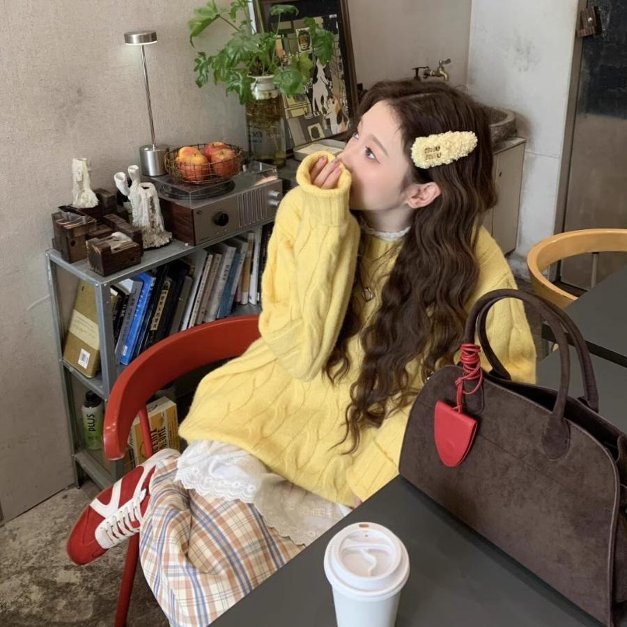 黄色のミルクfufu超美しい麻花セーター感冬は厚くて怠惰で柔らかいモチでゆったりした上着を着ている女性
