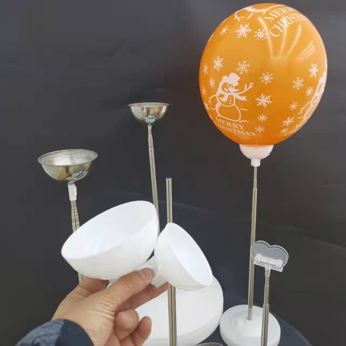 風船の偽の空が漂っているスタンドの端の鉄の碗の支えのプラスチックの碗の風船の伸縮する竿の鉄は風船の空を支えます。