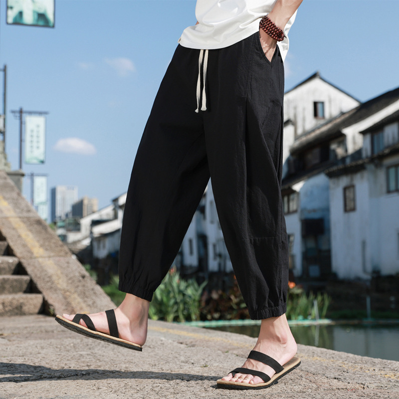 2024夏の新型中国風男性綿麻ハロン七分ズボン日系ファッションゆるい大サイズカジュアルパンツ