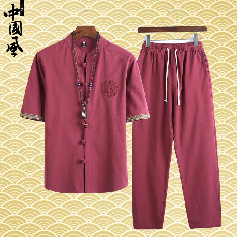 漢服男性亜麻シャツ刺繍セットファッション中国風立襟唐装綿麻シャツ2点セット男性復古