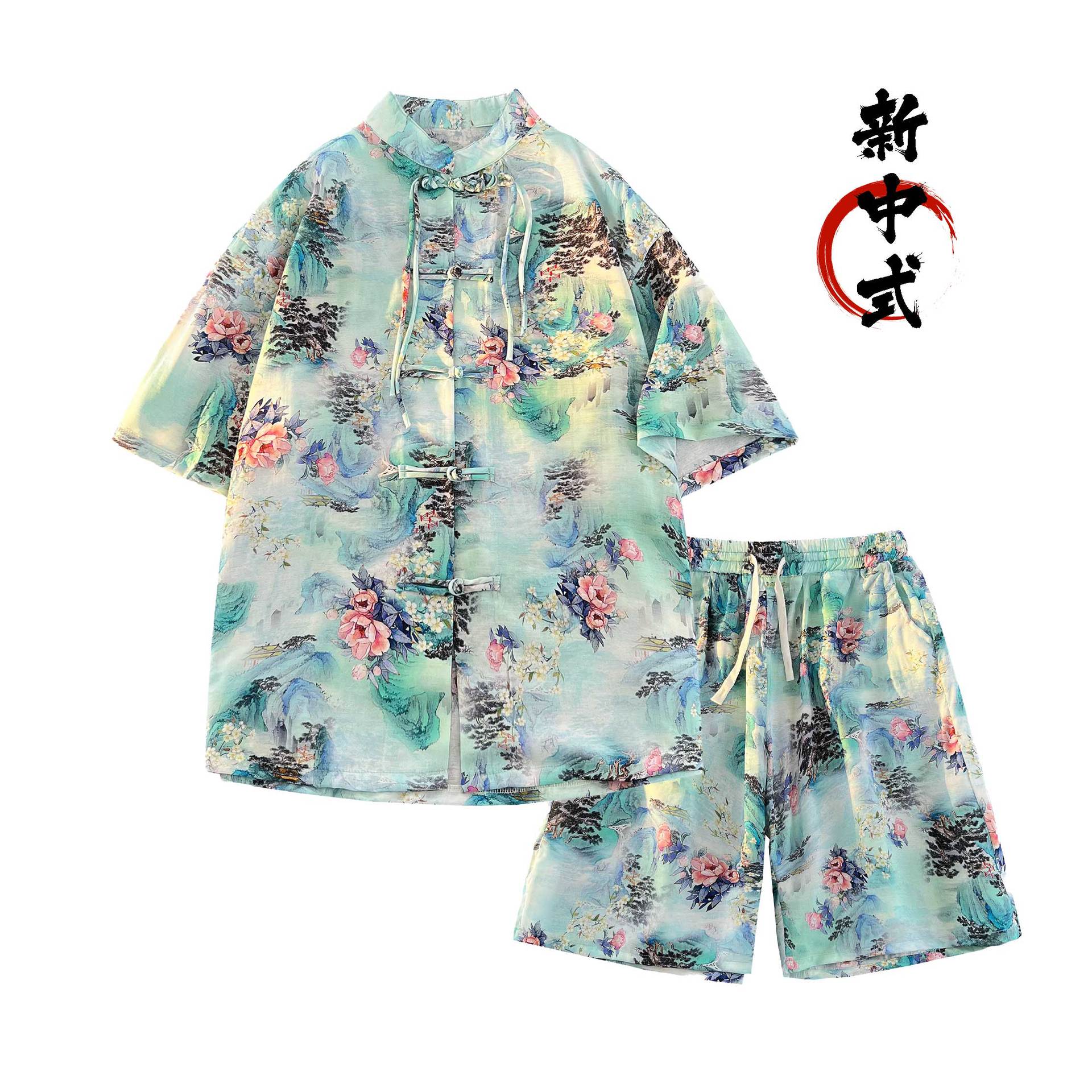 2024夏の新型中国風シャツセット国風ゆったり版男性カップルカジュアルセット卸売り