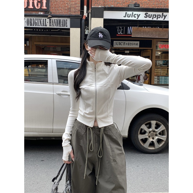 デザイン感魚骨ファスナー長袖カーディガンtシャツコート
