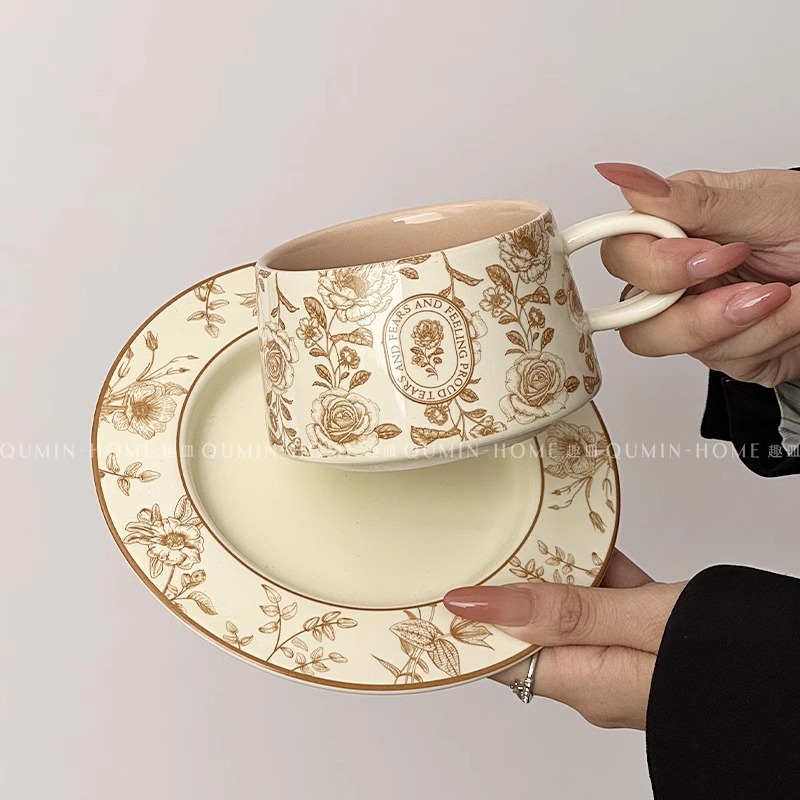 高価値インレトロセラミックコーヒーカップとソーサーセット女性用ライト高級ハイエンドラテカップ家庭用ウォーターカップギフト