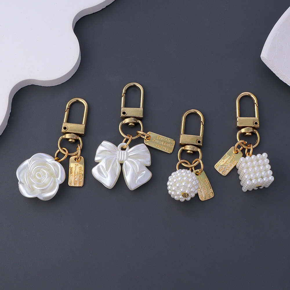 新商品のアクリルdiy蝶結びのバラのキーホルダーの真珠のフリンジの女性のキーチェーンのイヤホンのカバンのペンダント