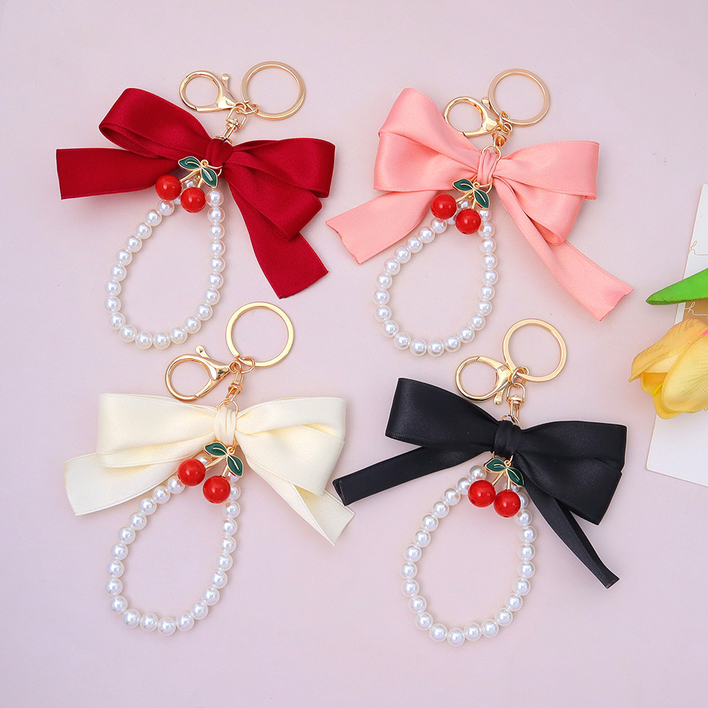 手作りの真珠のチェーンのキーホルダーのリボンの蝶結びのさくらんぼのペンダントの少女の心の包みは国境を越えてよく売れています。