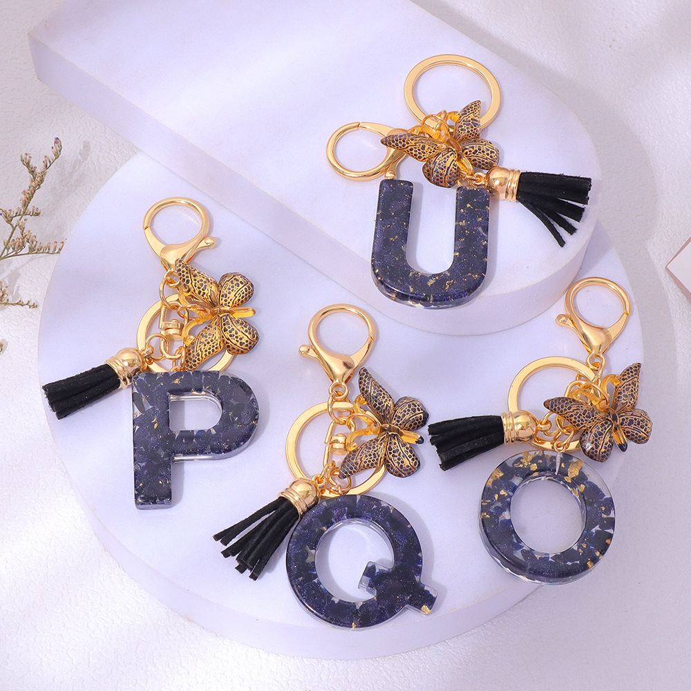 黒い石は金箔のアルファベットのキーホルダーを埋めます。