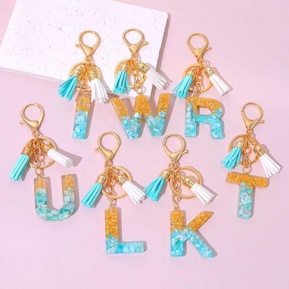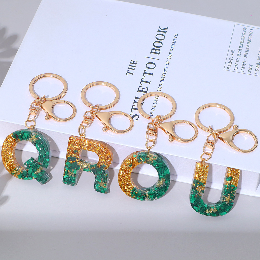 A-Zの緑の石は金箔のアルファベットのキーホルダーを埋めます。