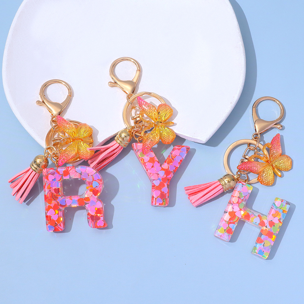 ピンクのスパンコールのアルファベットのキーは蝶のフリンジのペンダントを掛けます。