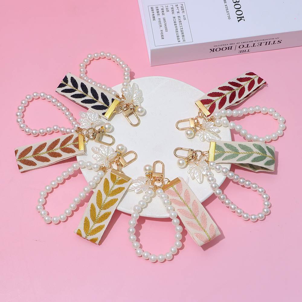 小清新布芸木の葉のリボンのキーホルダーは女の子が真珠のチェーンを持っています。