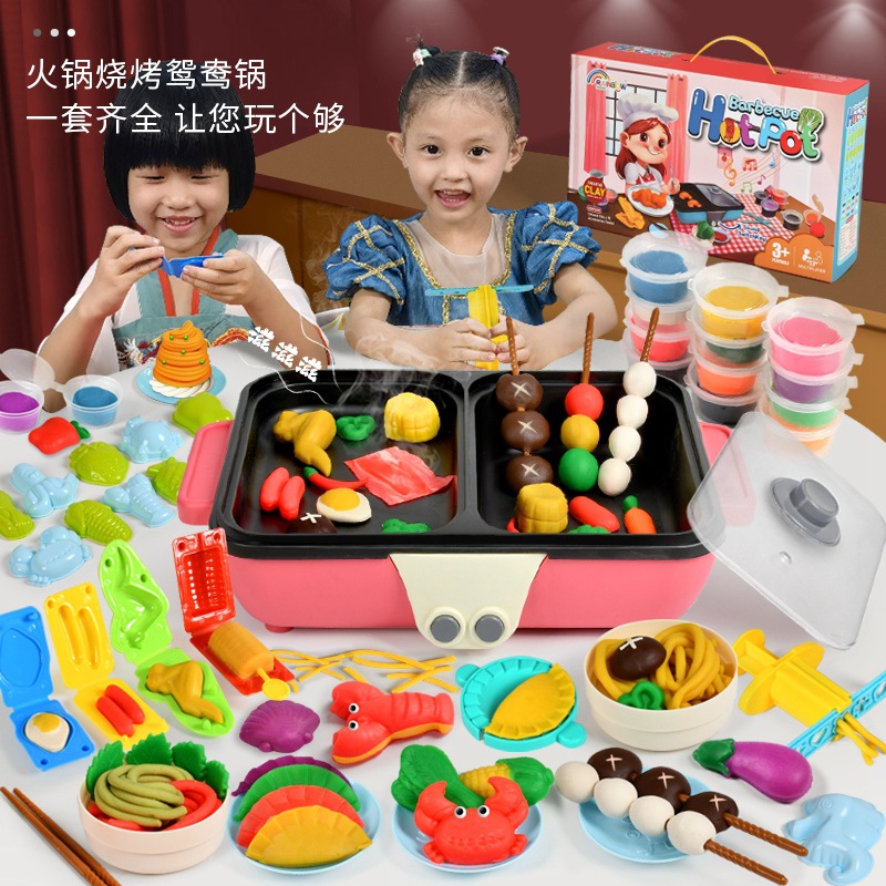 子供の台所は鍋の色の泥のおもちゃのセットをシミュレーションします。