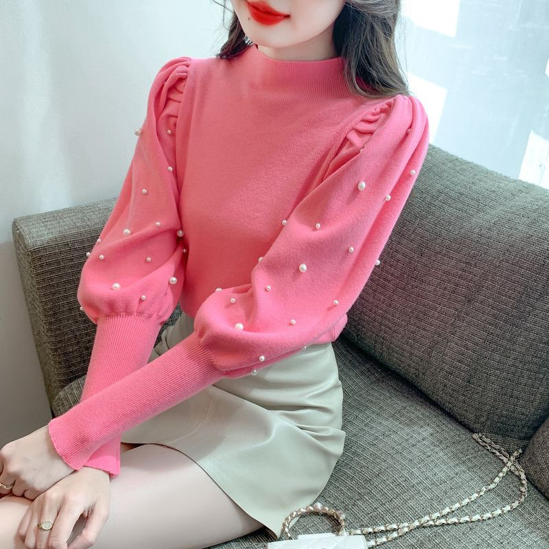 半高襟ニットの底のシャツの女性の2024新型の春と秋の爆発の灯籠の袖のセーターのファッション的な洋風の中で上着を掛けます。