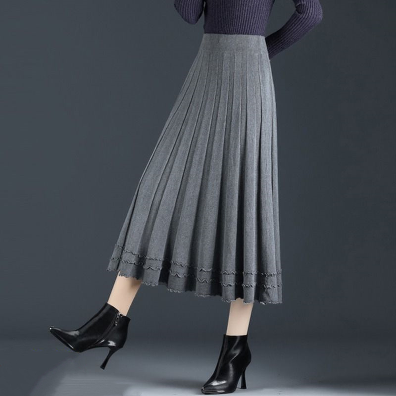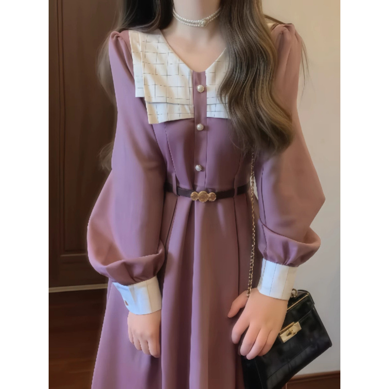 フランス式のお茶の休憩の気質は腰を収めてやせているワンピースの女子学生の学院の風は長袖を合わせて膝の中の長いスカートを越えます。