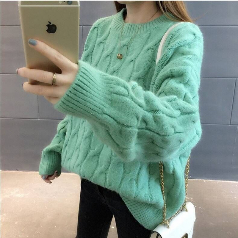 2024冬の女装のゆるいプルオーバーは、丸首の麻花のニットの短いファッションの学生のコートのセーターの女性を厚くします。