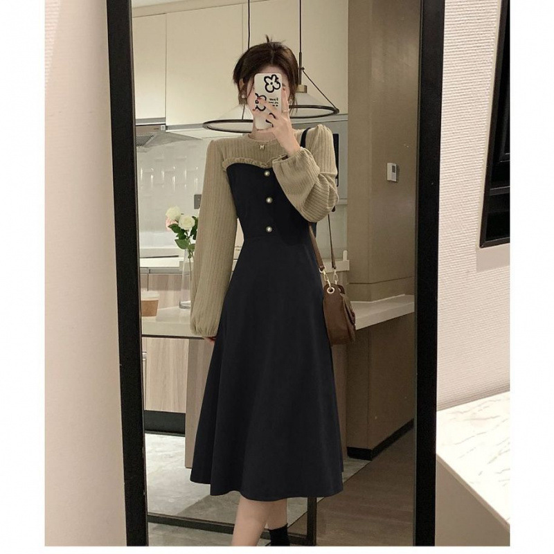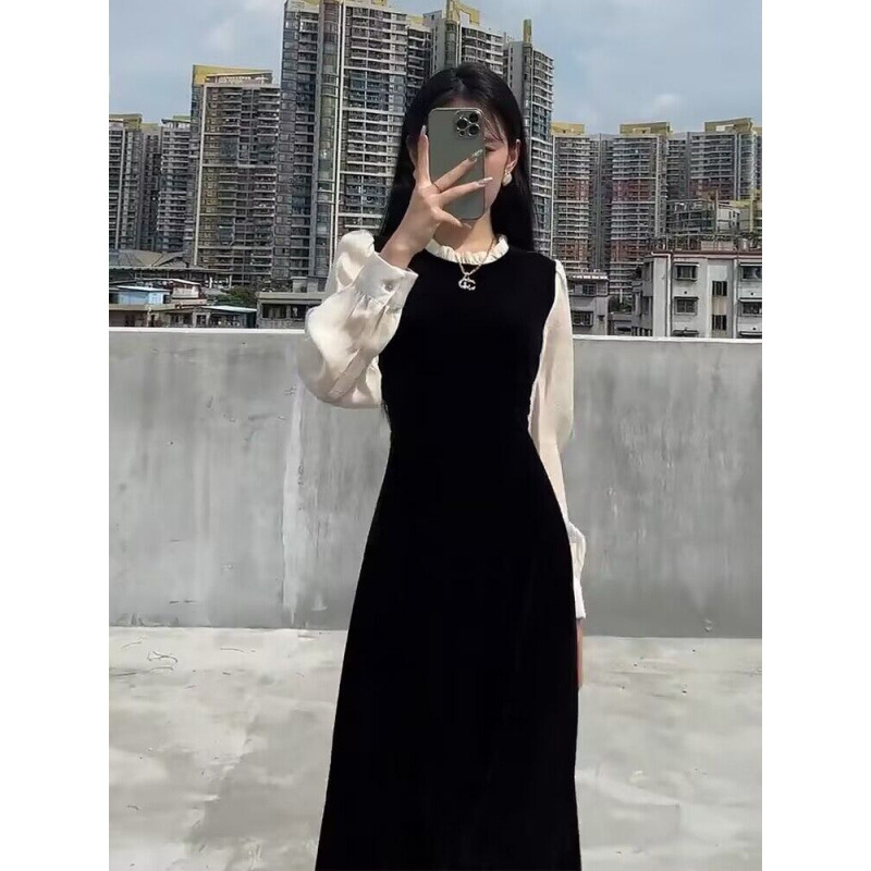 小柄な長袖の偽の2つのスーツのベルベットのワンピースの秋の冬の2024の新型の婦人服のロングスカート感