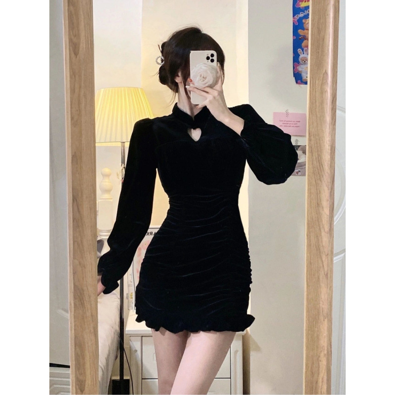 秋の夜のドレスのスカートの女性の宴会の2024の新型のヘボンの小さい黒いスカートの名媛の風の気質は尻のベルベットのワンピースを包みます。