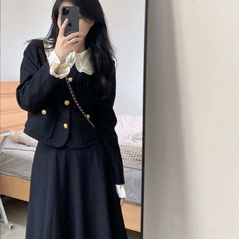秋の新作の優雅な赫本の小さい香風のスーツの女性の白黒は色の偽の2つのコートの半身のスカートの2つのセットの潮にぶつかります。