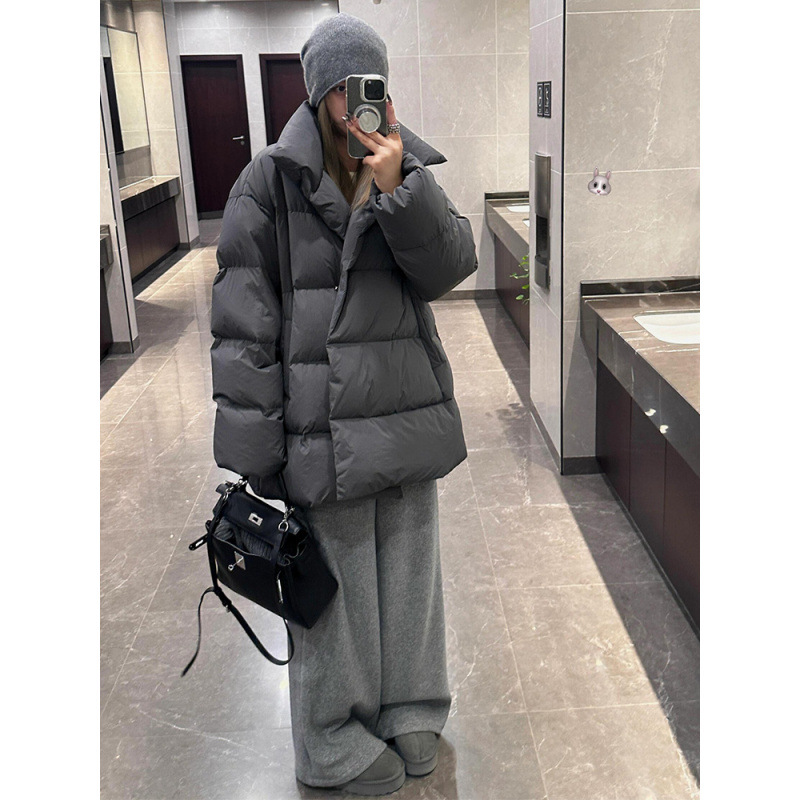 大きいサイズのデザイン感のある灰色の羽毛の綿服の女性の秋冬の2024の新型の防寒は厚い保温のパンの服のコートを厚くします。