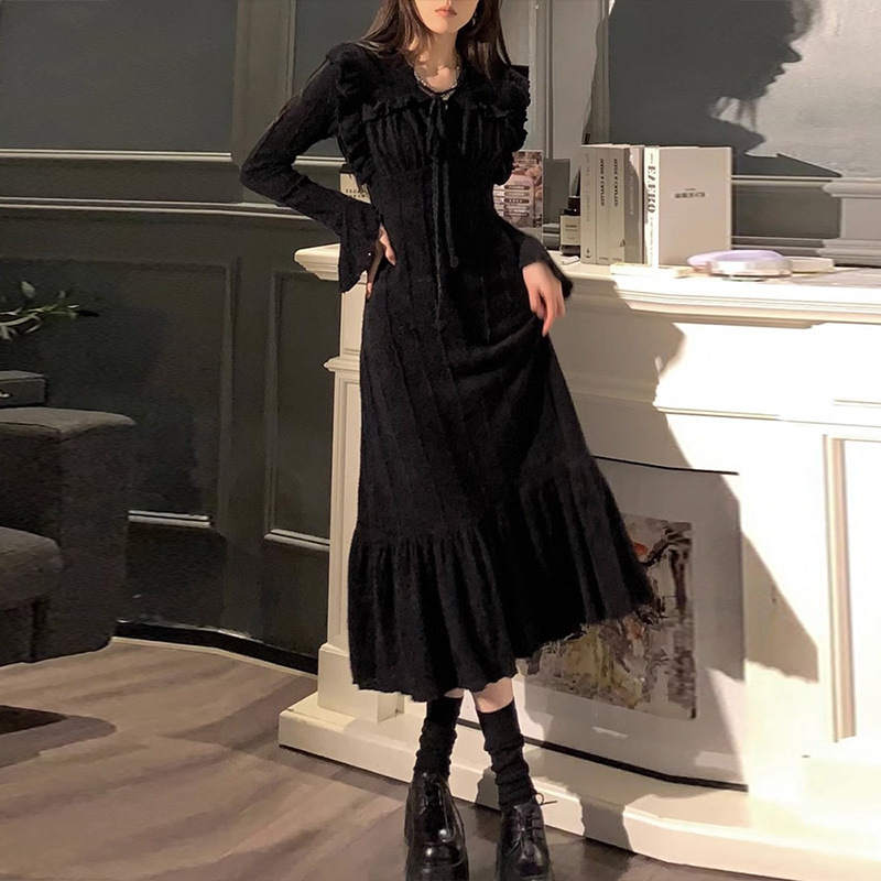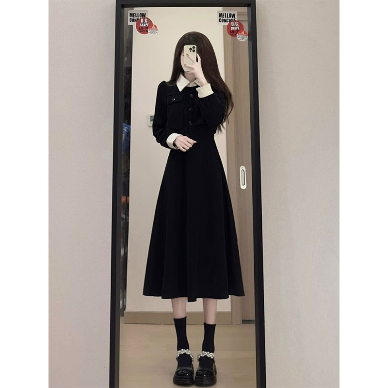 春と秋の冬のスカートの新型の純欲風の黒いフランスのワンピースの女性の中で偽の2枚を掛けて腰の中で長いスカートを収めます。