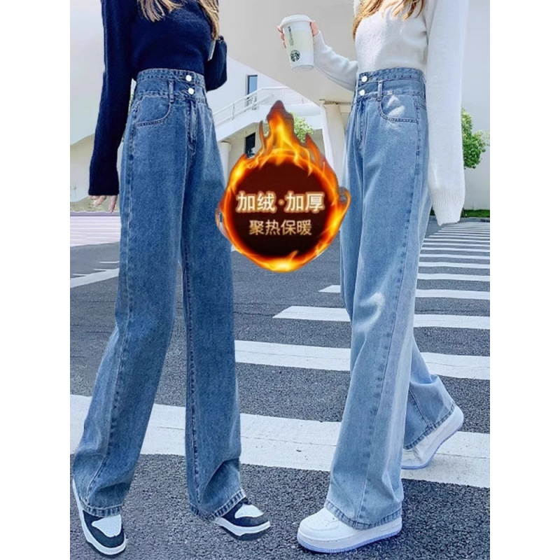 ベルベットは腰が高くて足が広いジーンズの女性秋冬2024年の新型の小柄な直筒狭版モップパンツを厚くした