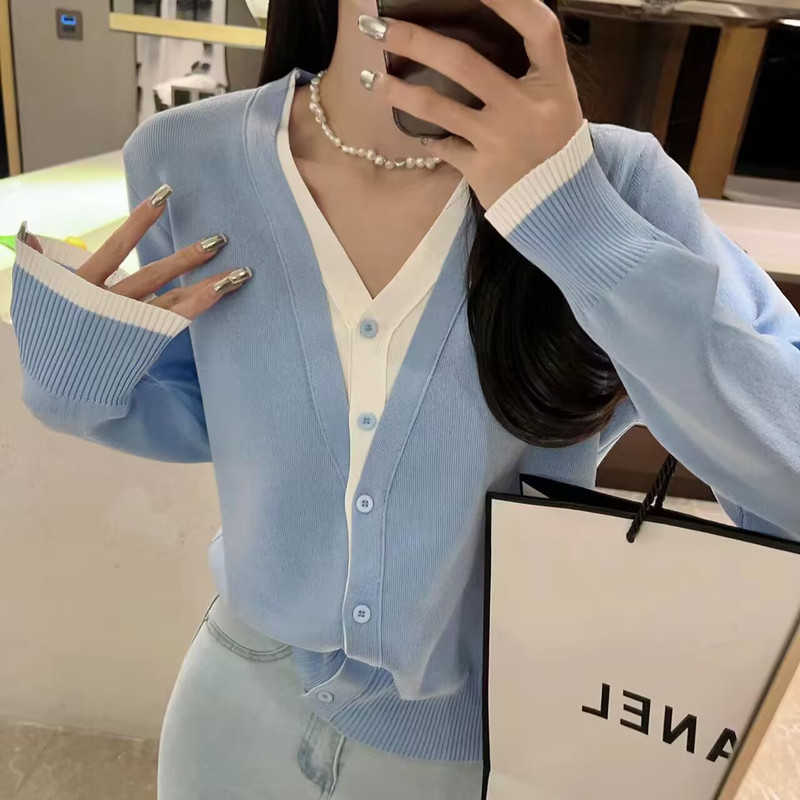 短い香りの小さいvネックのセーターの女性の秋の2024新型の婦人服の爆発的な長袖のメリヤスのカーディガンの上着