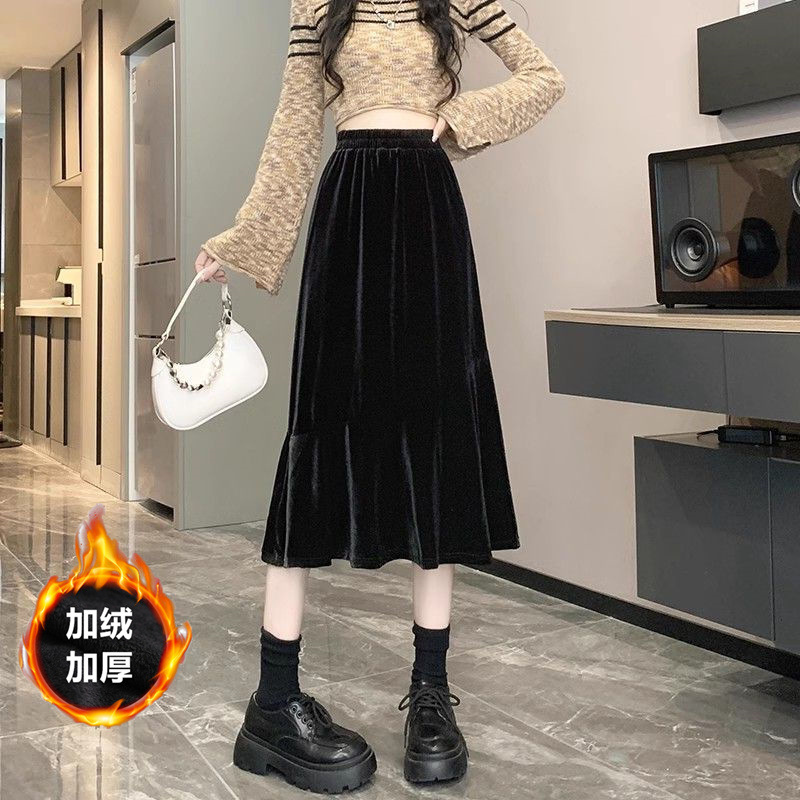 冬にベルベットを厚くしたベルベットのスカート女性の高腰a字スカートの中の長さの小柄なペンダント感魚尾スカート