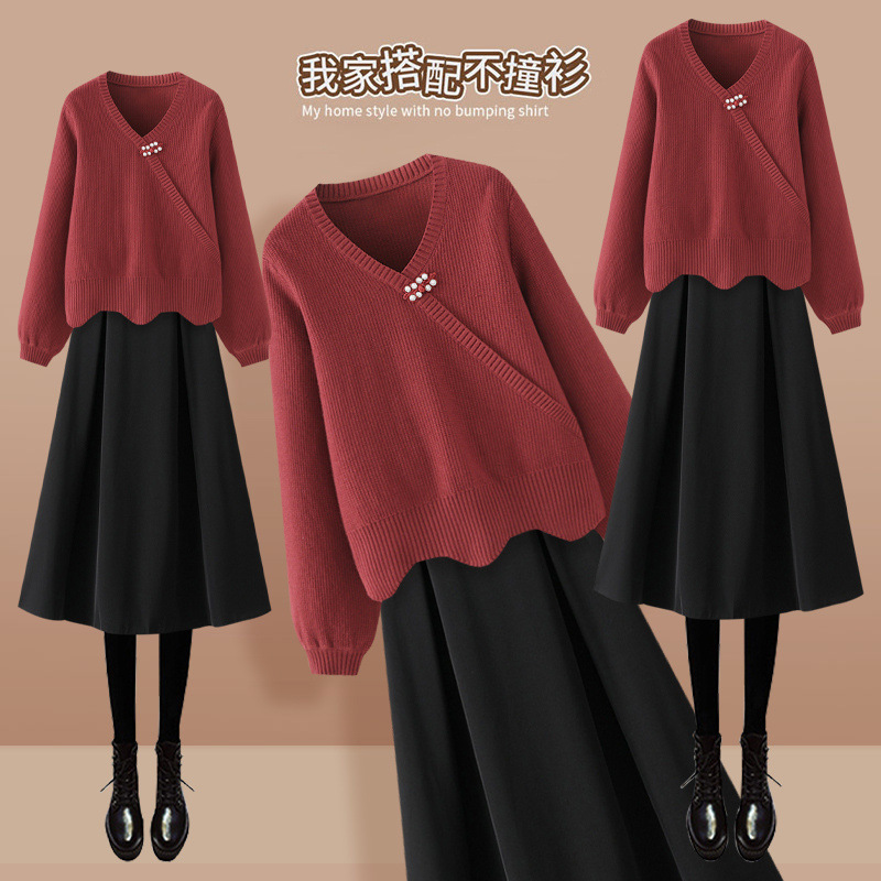 冬のスーツの女性2024の新型の大きいサイズの婦人服は肉を遮ってやせているデザイン感のセーターの高腰の半身のスカートの2つのセットを現します。