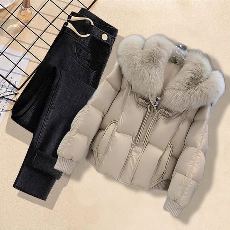 冬のスーツの女性2024の新型の大きいサイズのファッション盤は綿の服のコートの女性を掛けて合わせてやせているジーパンの2セットを現します。