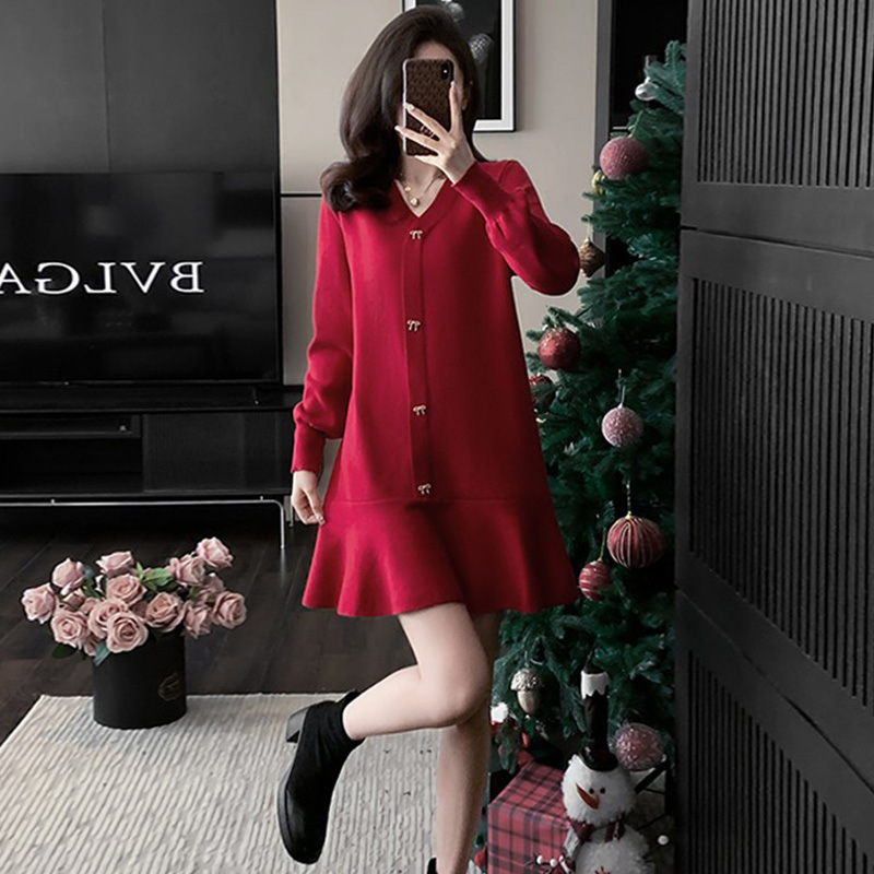 フランス風の気質のハスの葉の縁のニットのワンピースの女性の秋冬の新型のvネックの中に赤いゆるいセーターのスカートを掛けます。