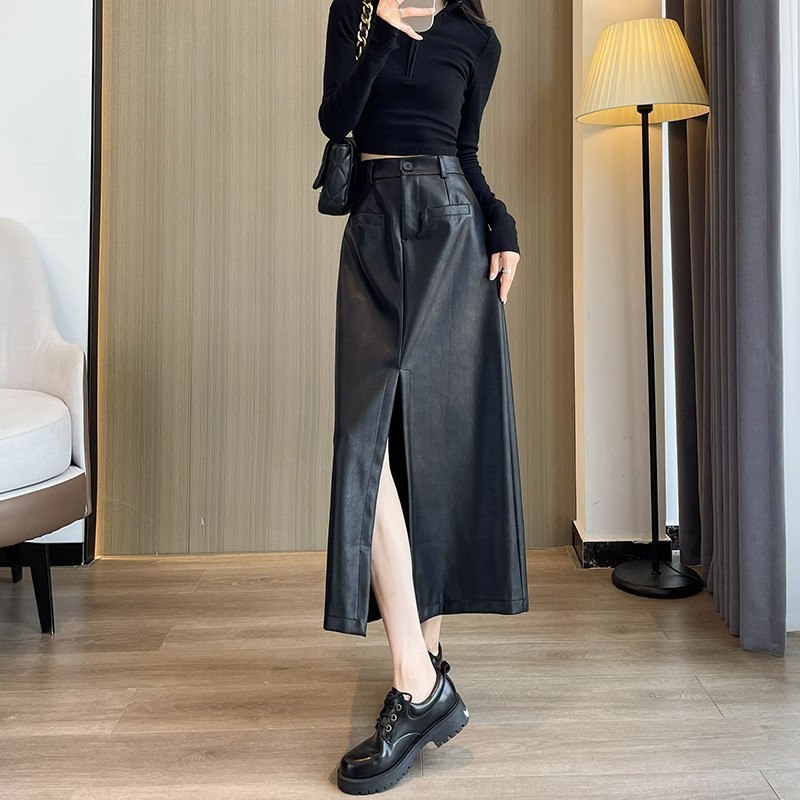 黒いpuの皮のスカートの半身のスカートの女性の秋冬の2024年の新型の中で長いです。